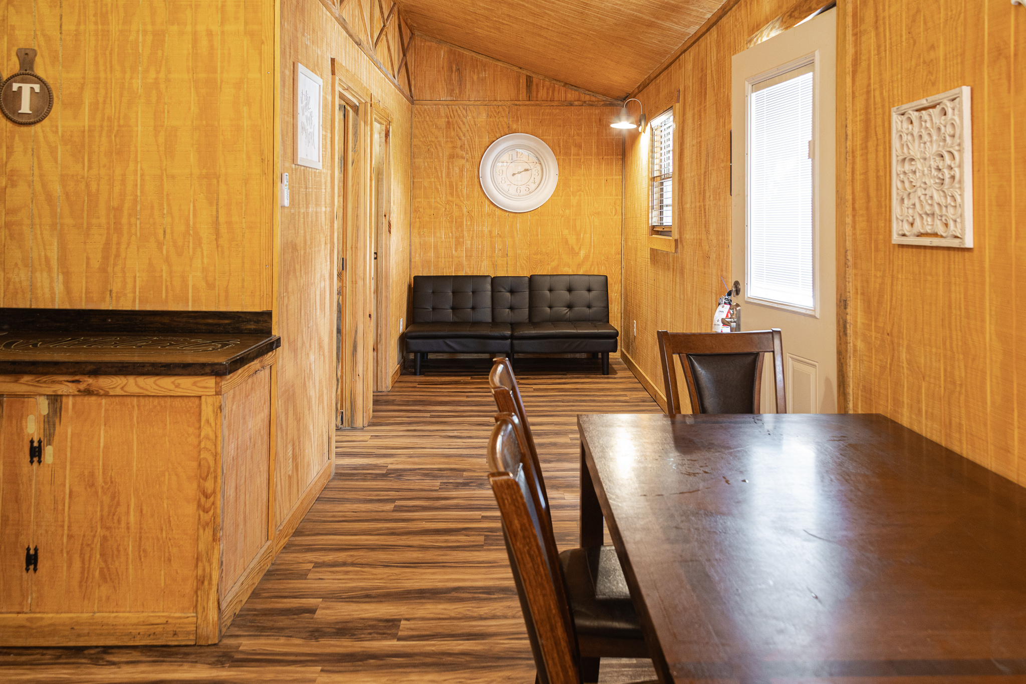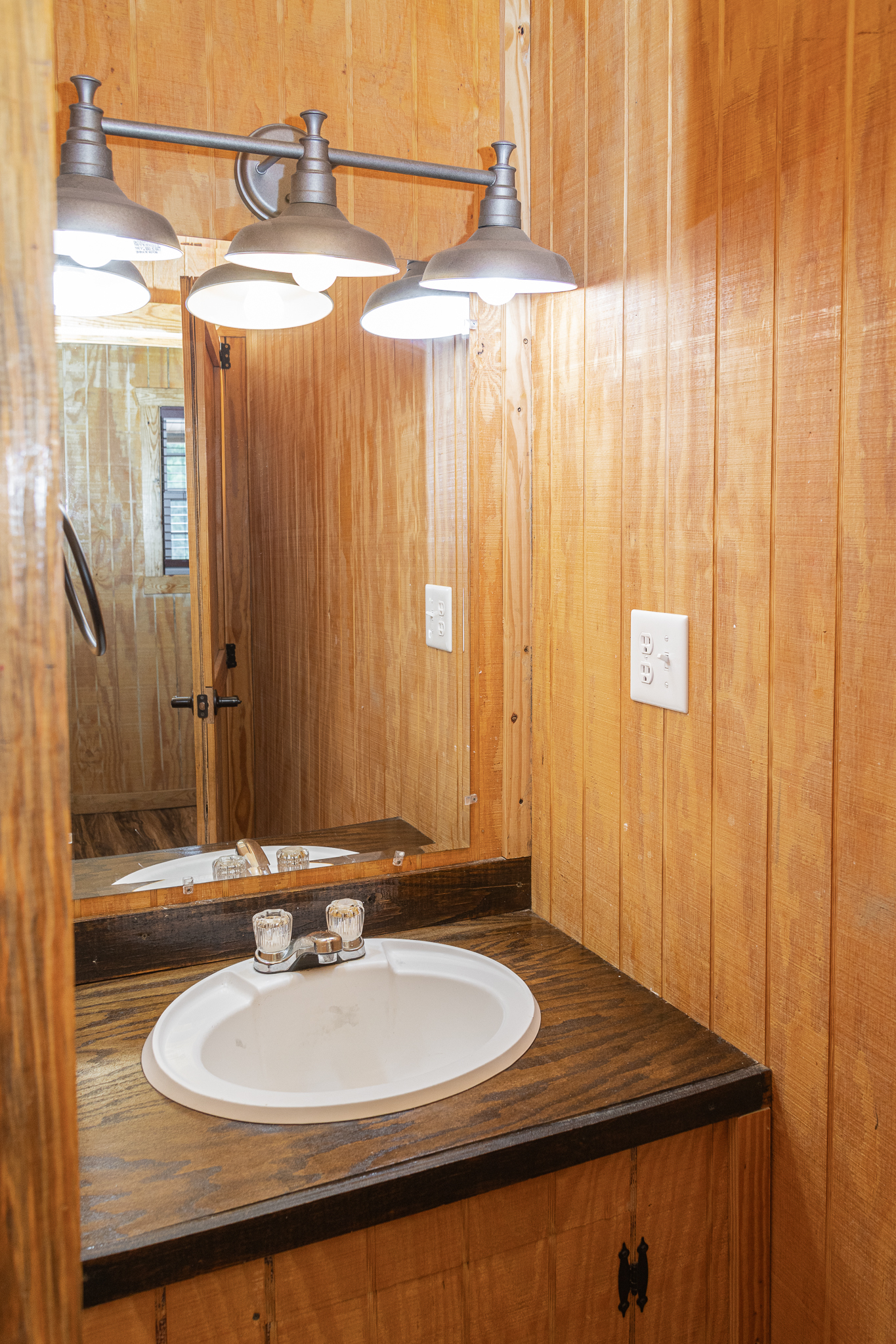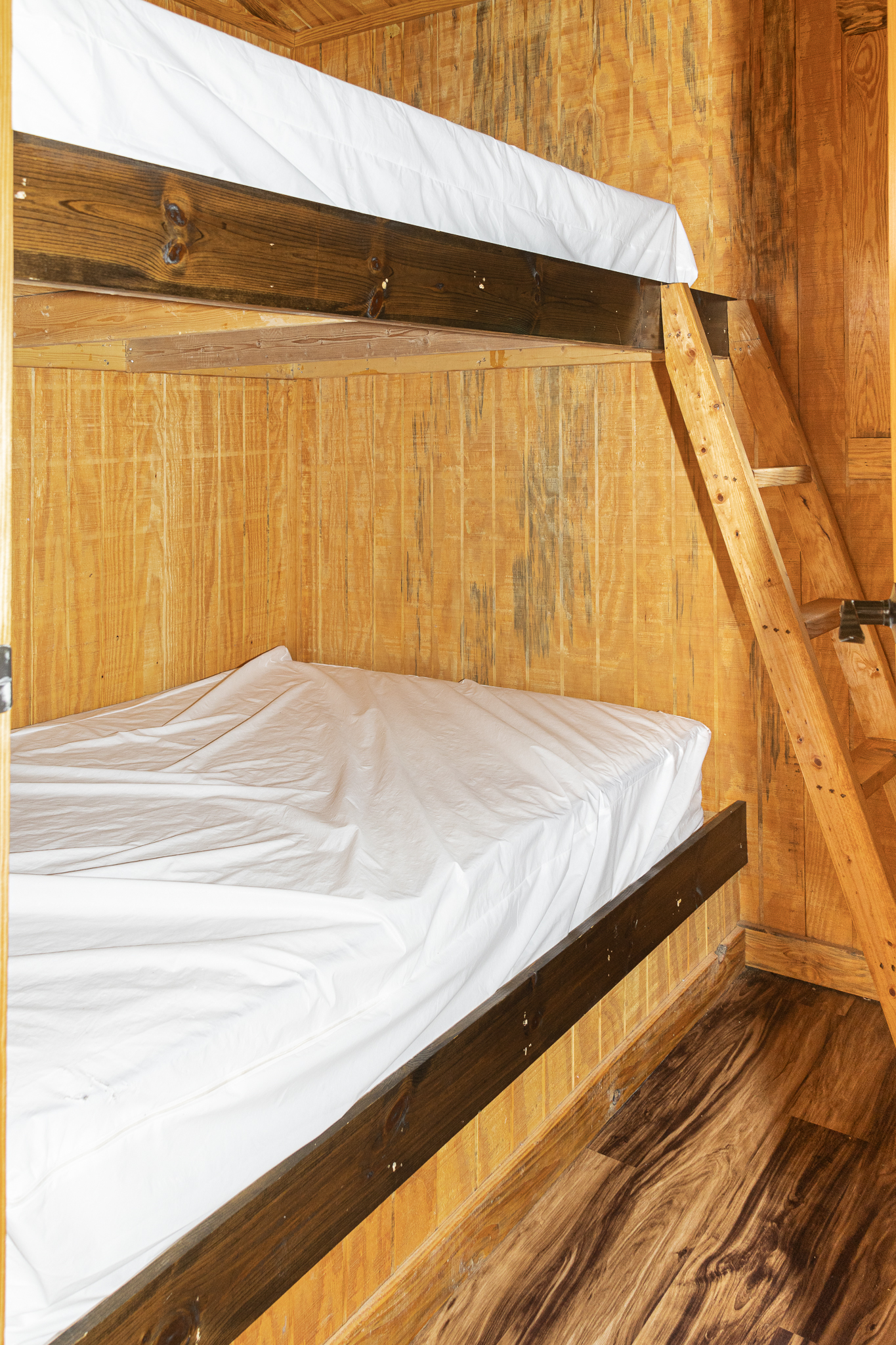 Two bedroom cabin, sleeps 12 counted two per bed. Each bedroom has a set of full size bunkbed. There is also two full size futons in the main room. It has a kitchenette, with a grill and fire pit outside. Rental does not include linens or dishes.